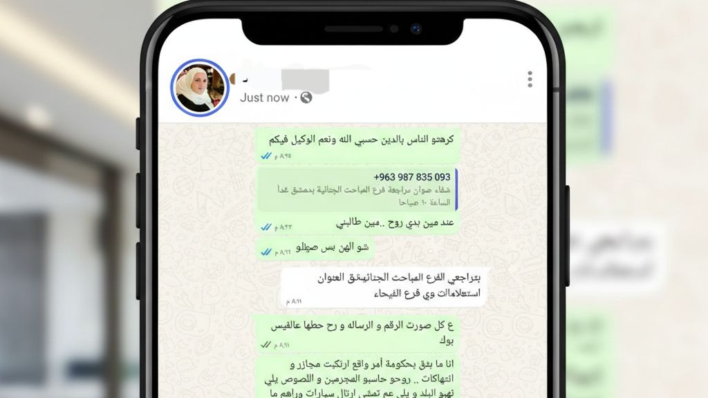وفقاً للمحادثة المسربة، تلقّت صوان رسالة من رقم يحمل الرمز الدولي السوري، تضمن نصها: “شفاء صوان، مراجعة فرع المباحث الجنائية بدمشق غداً الساعة 10 صباحاً”. وعند استفسارها عن السبب، أجاب الطرف الآخر بعبارة مقتضبة: “بتراجعي الفرع بتشوفي الموضوع، نحن كاستعلامات مهمتنا نخبرك”.